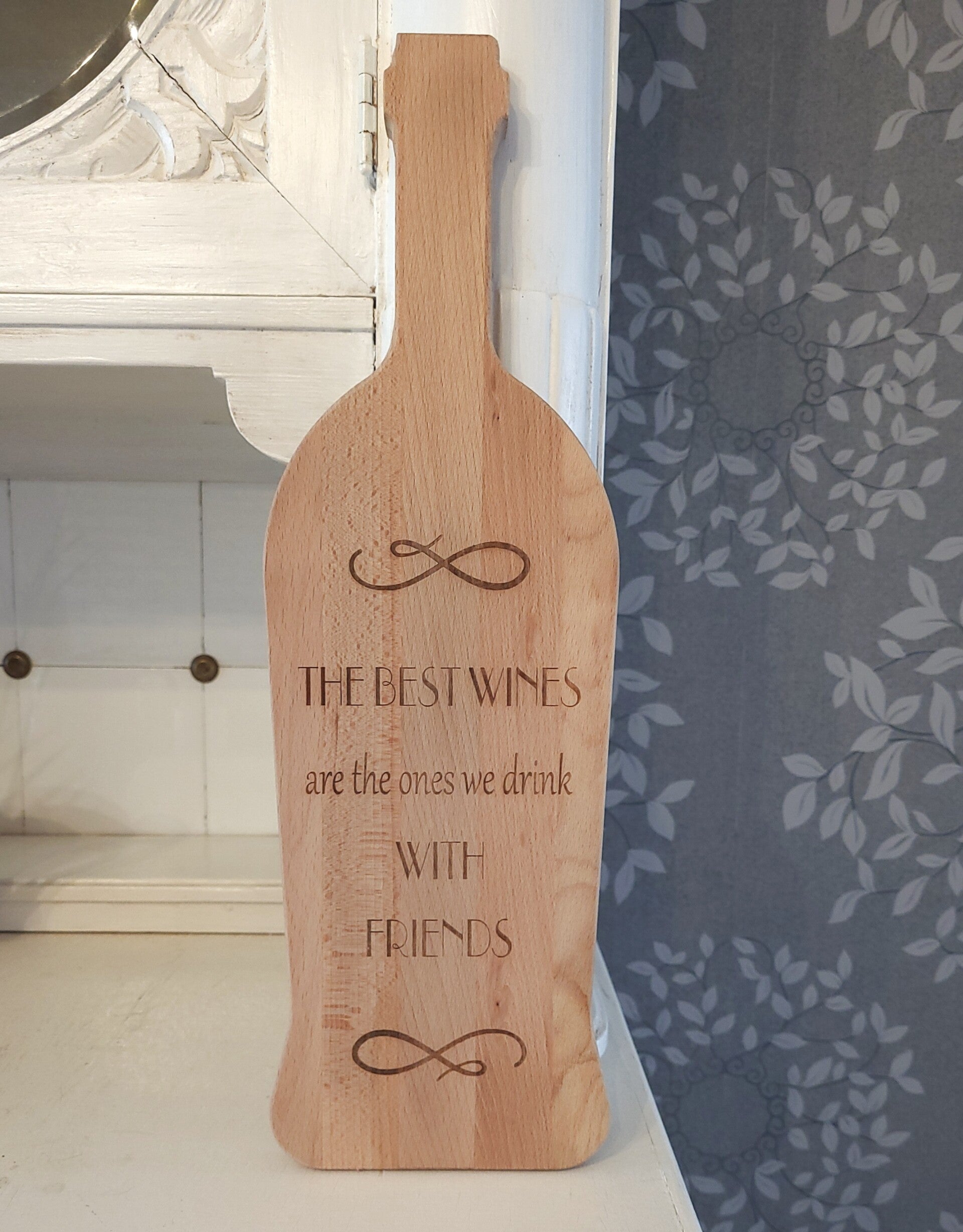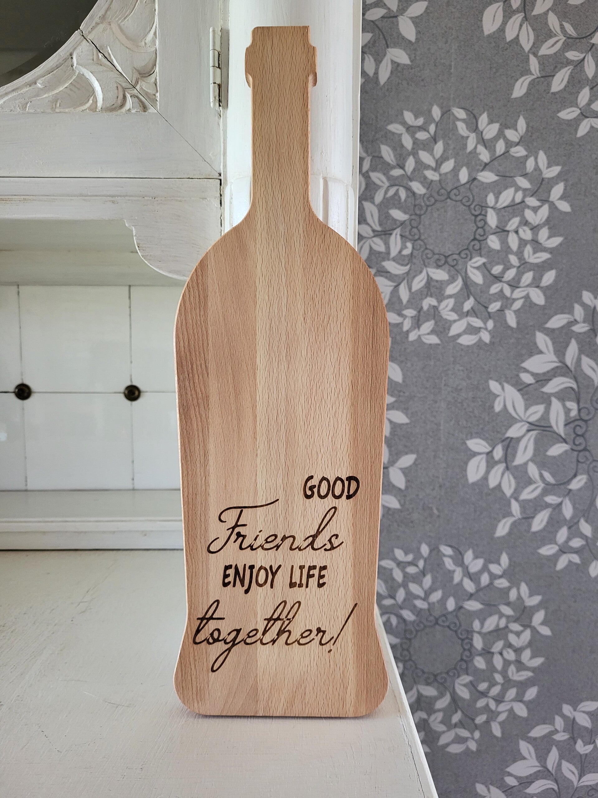 Onze Vidar plank is de enige echte plank in de vorm van een wijnfles, ambachtelijk geproduceerd van duurzaam beukenhout en reeds behandeld met olie.