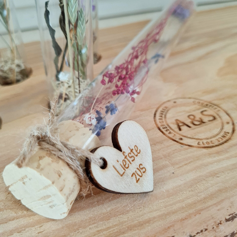 Droogbloemen in glazen buisjes met een persoonlijke boodschap.